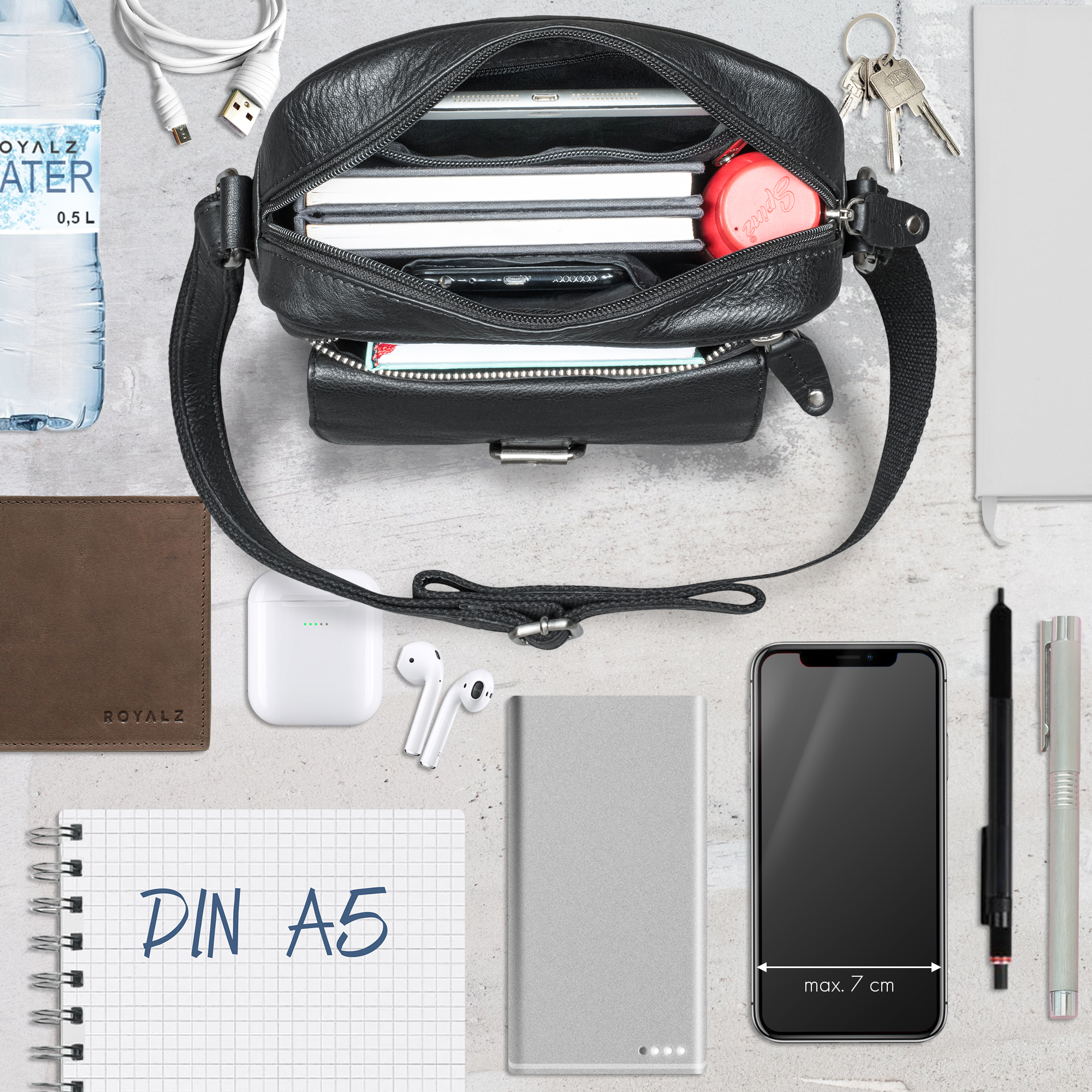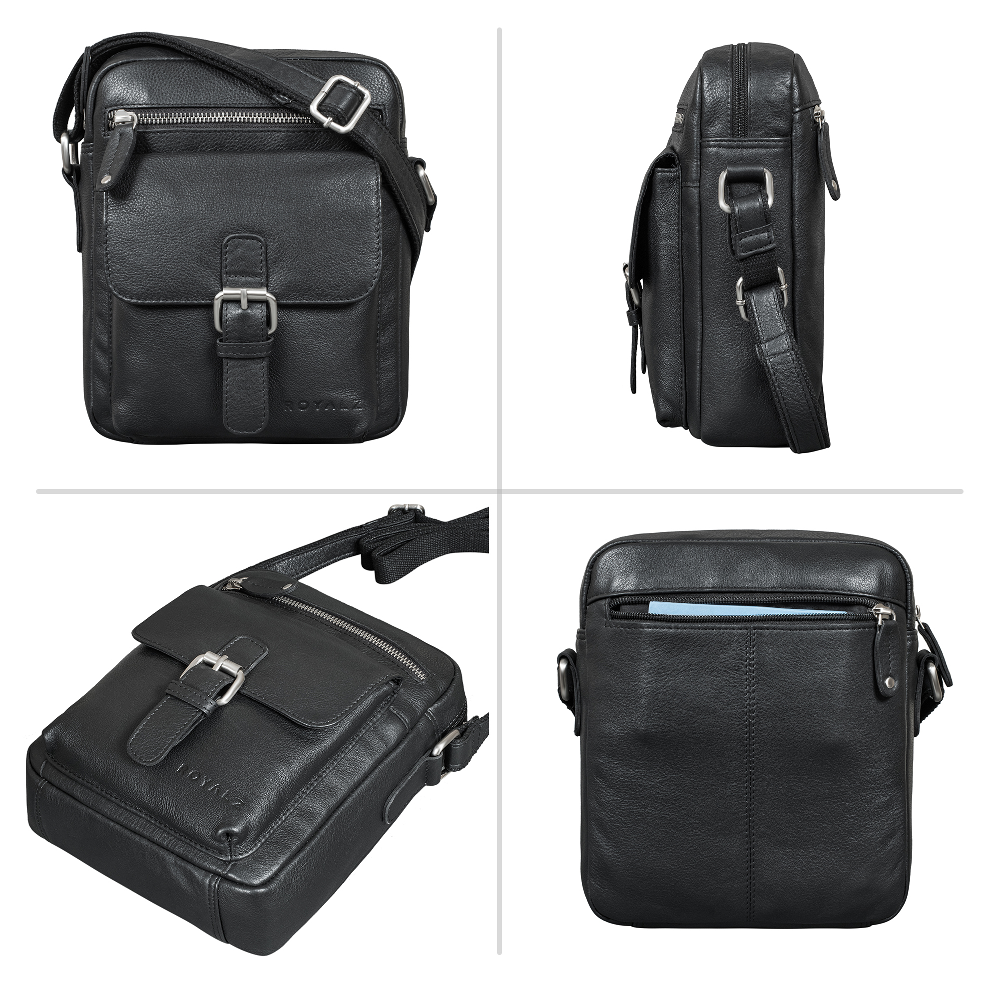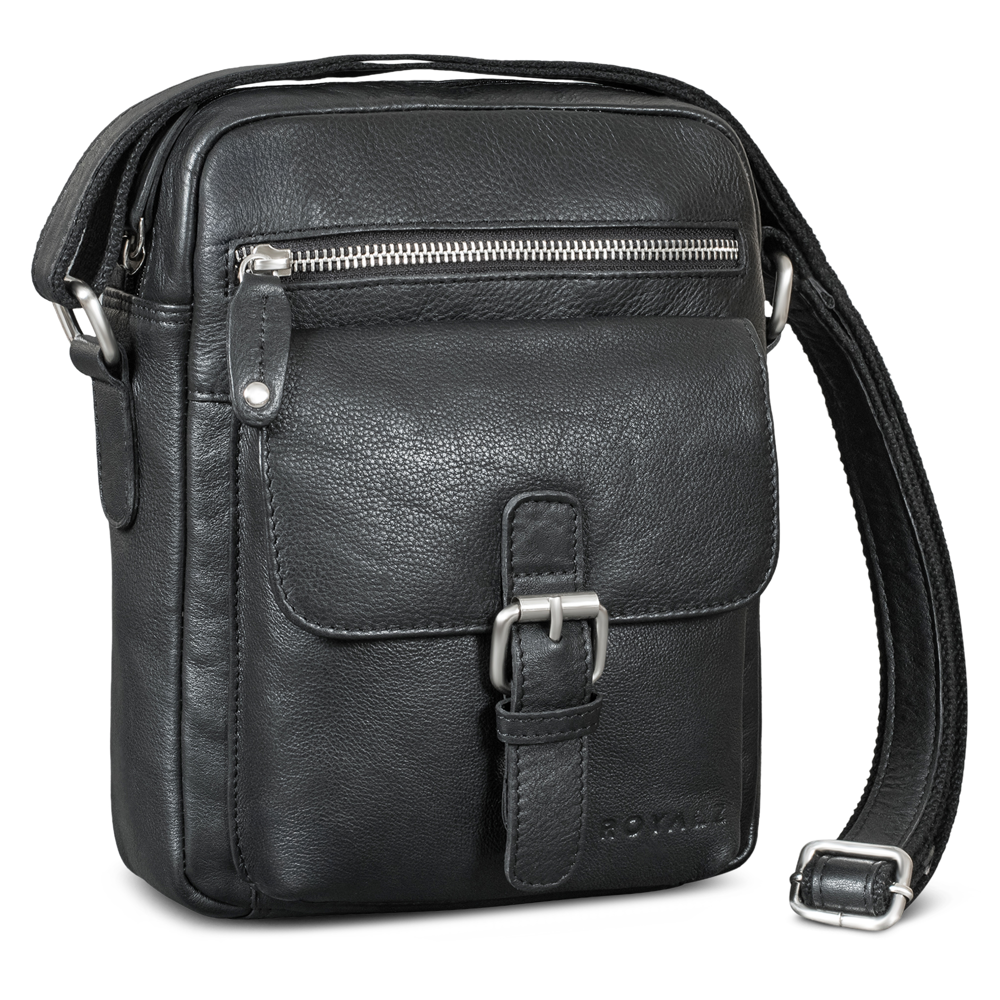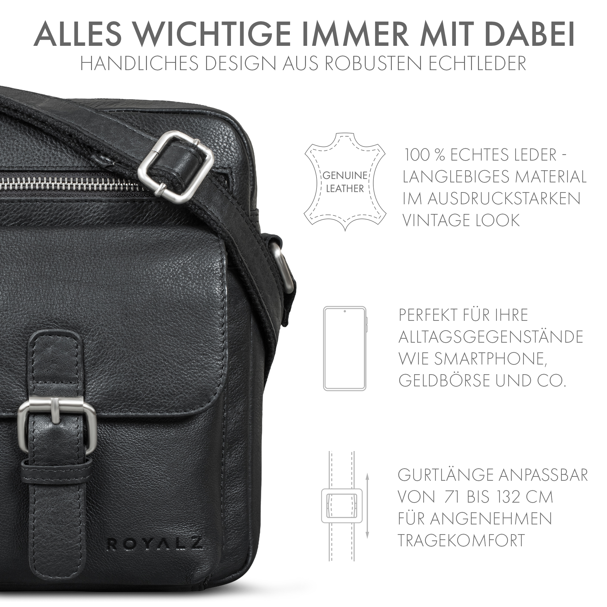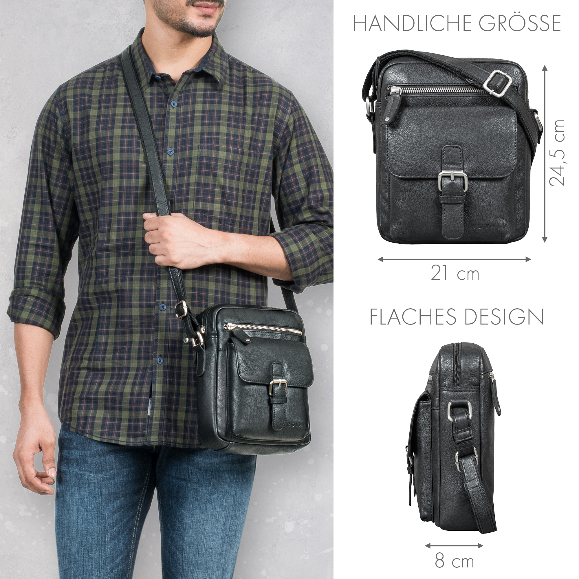 - ROYALZ "Glendale" Echtleder Umhängetasche: Maße (LxBxH): 24,5 x 8 x 21 cm | Gewicht: 551 g | Material: Echt Leder Rind | Verstellbarer Schultergurt: 71 - 132 cm | Leichtgängiger Reißverschluss