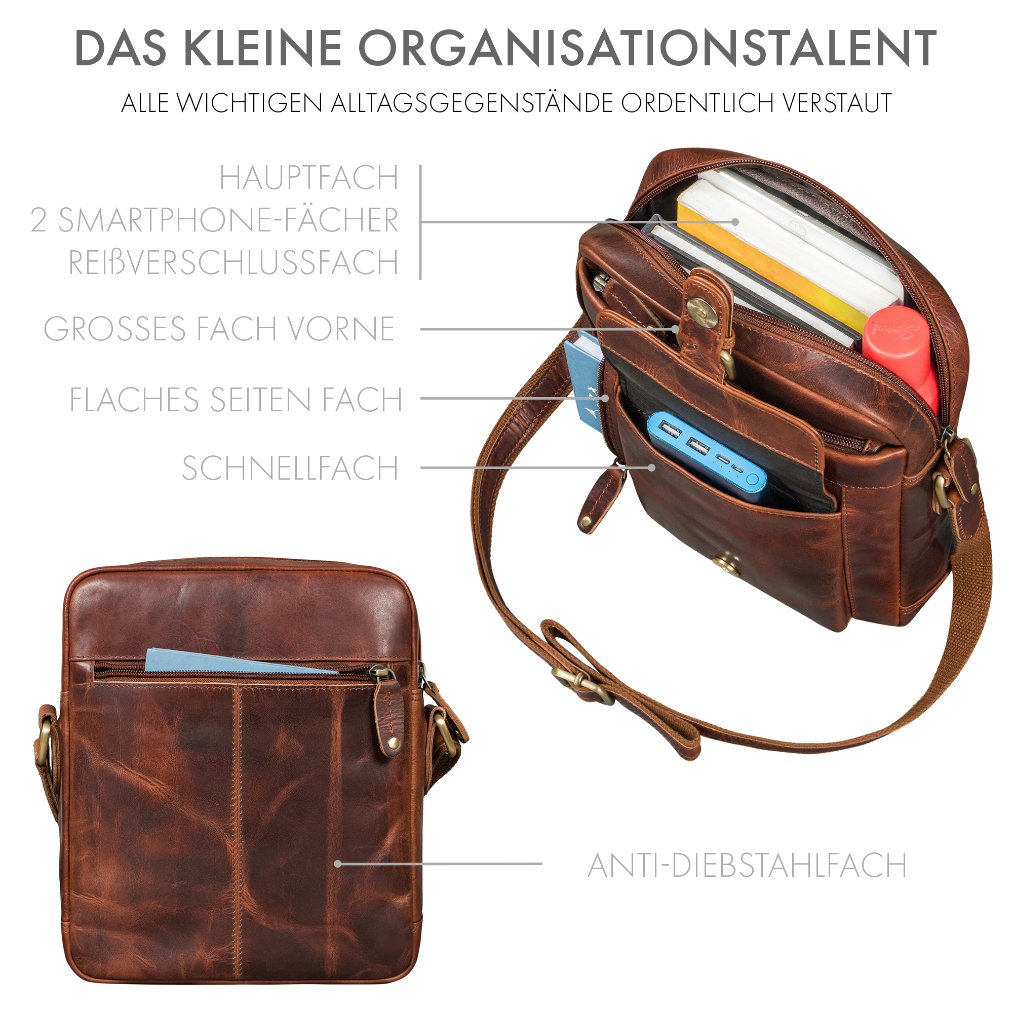 - Durchdachte Fächeraufteilung - Die Umhängetasche Herren klein Leder hat 1 Hauptfach mit 2 Smartphone-große Fächer und 1 Seitenfach mit Reißverschluss, 3 Fächer vorne und 1 1 Anti-Diebstahlfach hinten