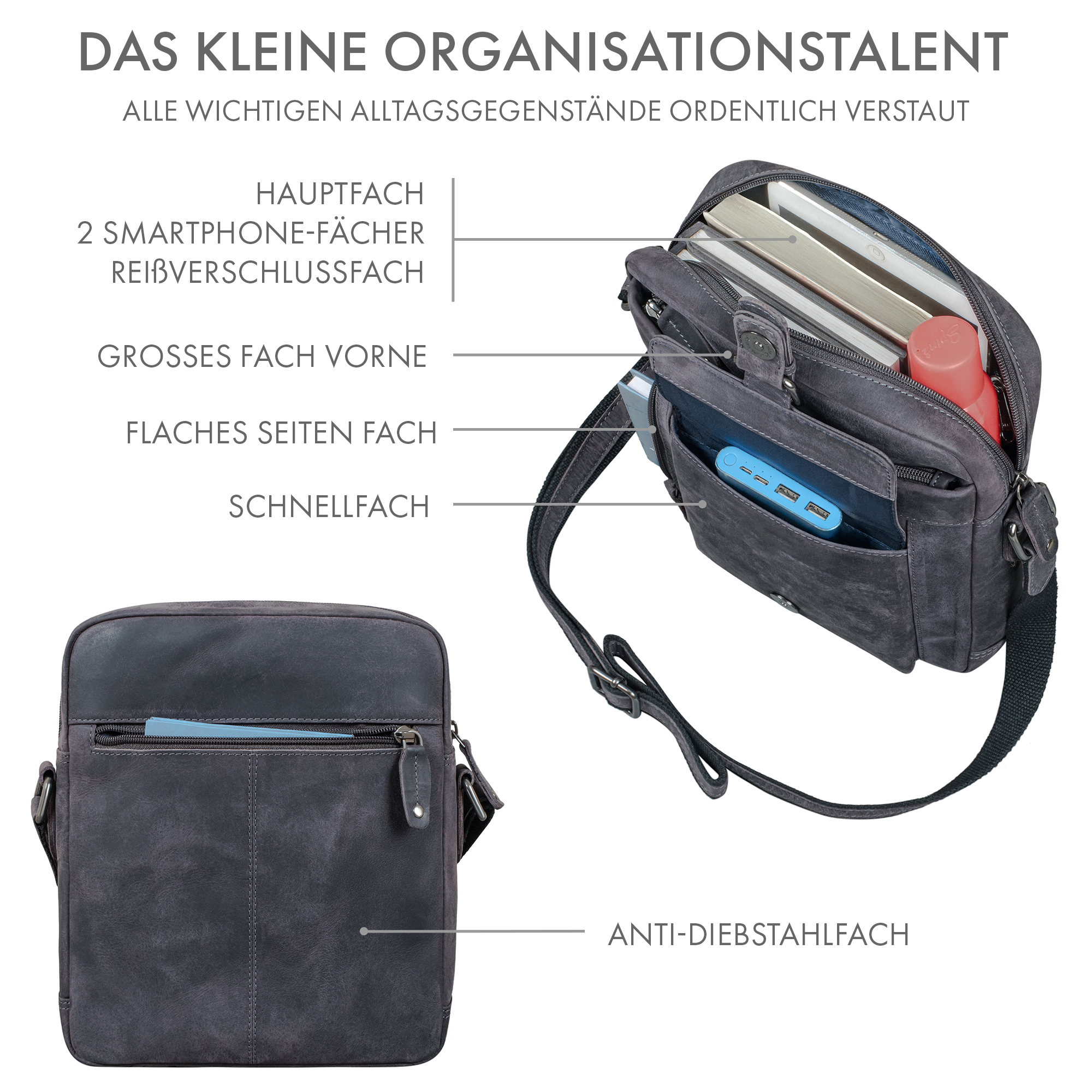 - Durchdachte Fächeraufteilung - Die Umhängetasche Herren klein Leder hat 1 Hauptfach mit 2 Smartphone-große Fächer und 1 Seitenfach mit Reißverschluss, 3 Fächer vorne und 1 1 Anti-Diebstahlfach hinten