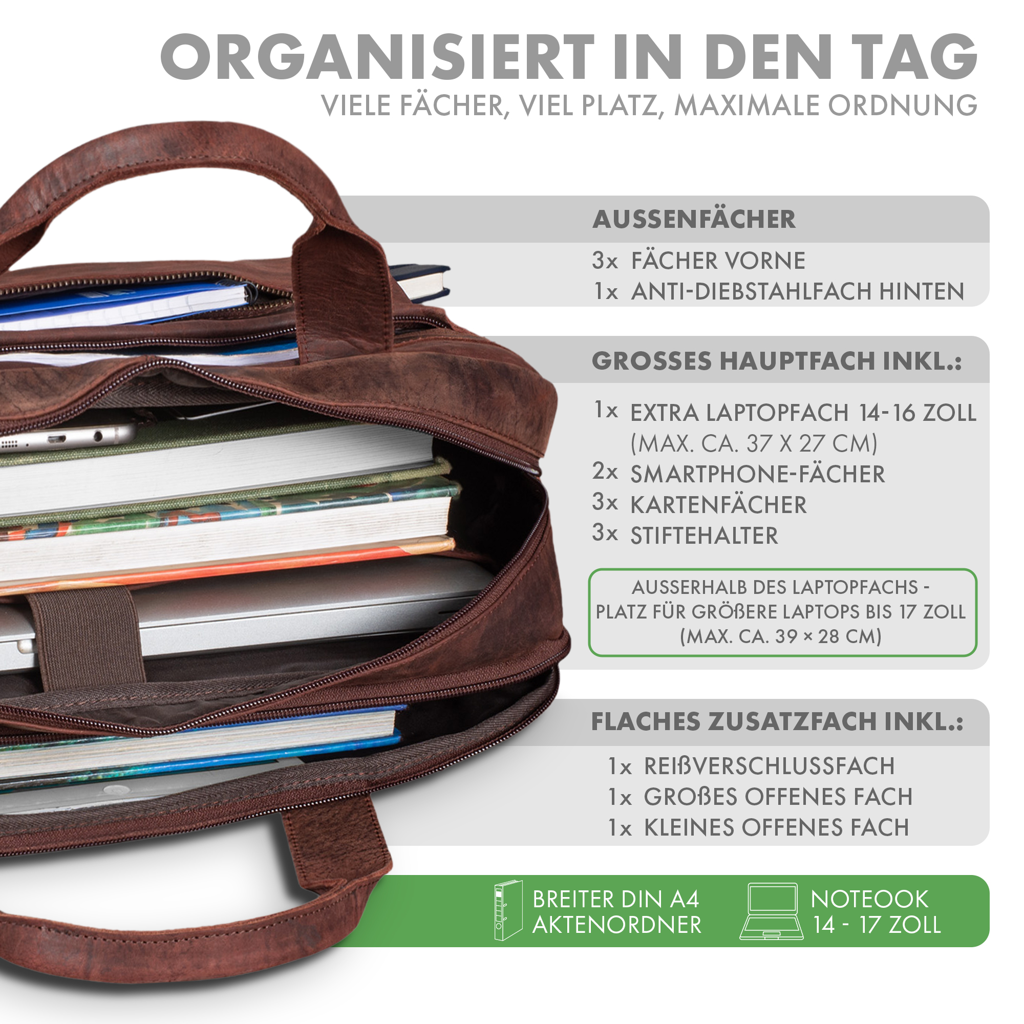 - Echtleder & langlebige Qualität - Aktentasche Leder Herren mit robusten, wasserabweisenden Echtleder hochwertig verarbeitet. Das naturbelassene Leder entwickelt mit der Zeit eine individuelle Patina und macht die Ledertasche besonders langlebig.