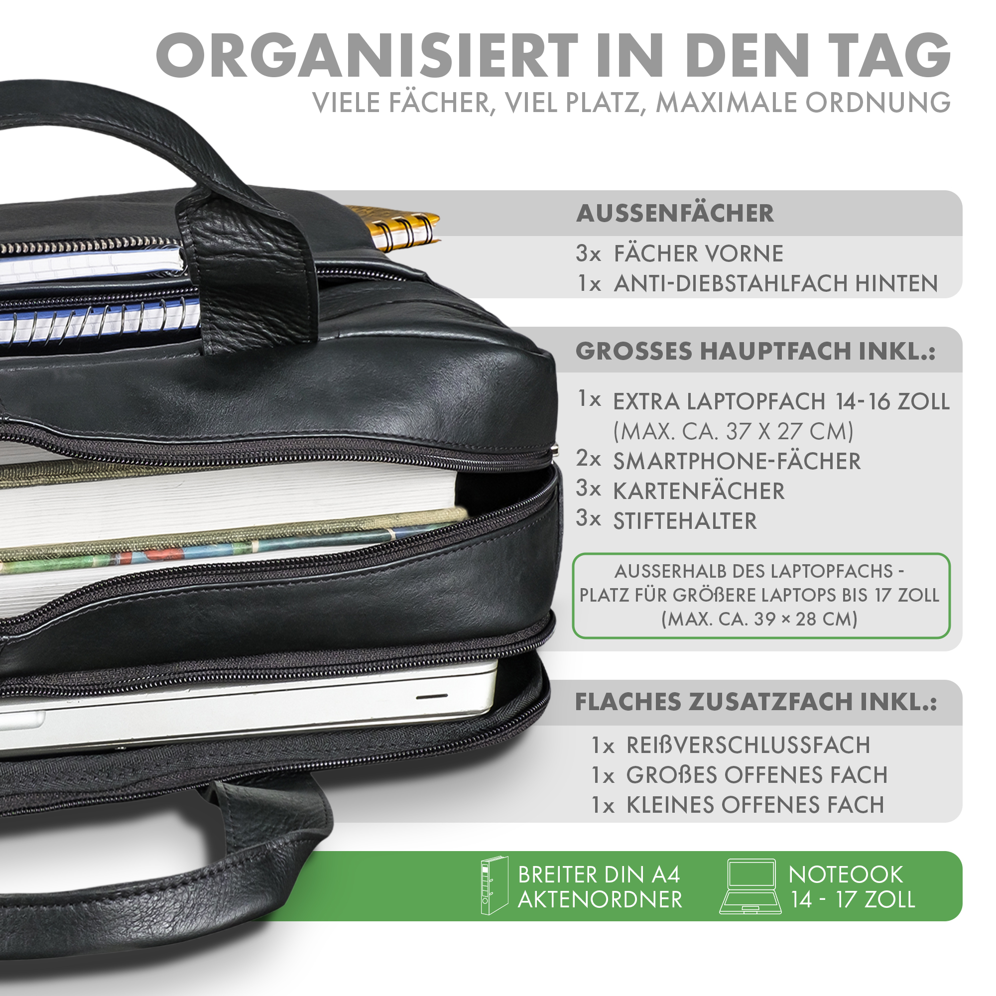 Großes Hauptfach für breite DIN A4 Ordner, Bücher und Arbeitsmaterialien inkl. 1 Gepolstertes Laptopfach bis ca. 15,6–16 Zoll (max. ca. 37 × 27 cm) - Zusätzlicher Platz für größere Laptops bis ca. 17 Zoll außerhalb des Laptopfachs (max. ca. 39 × 28 cm)