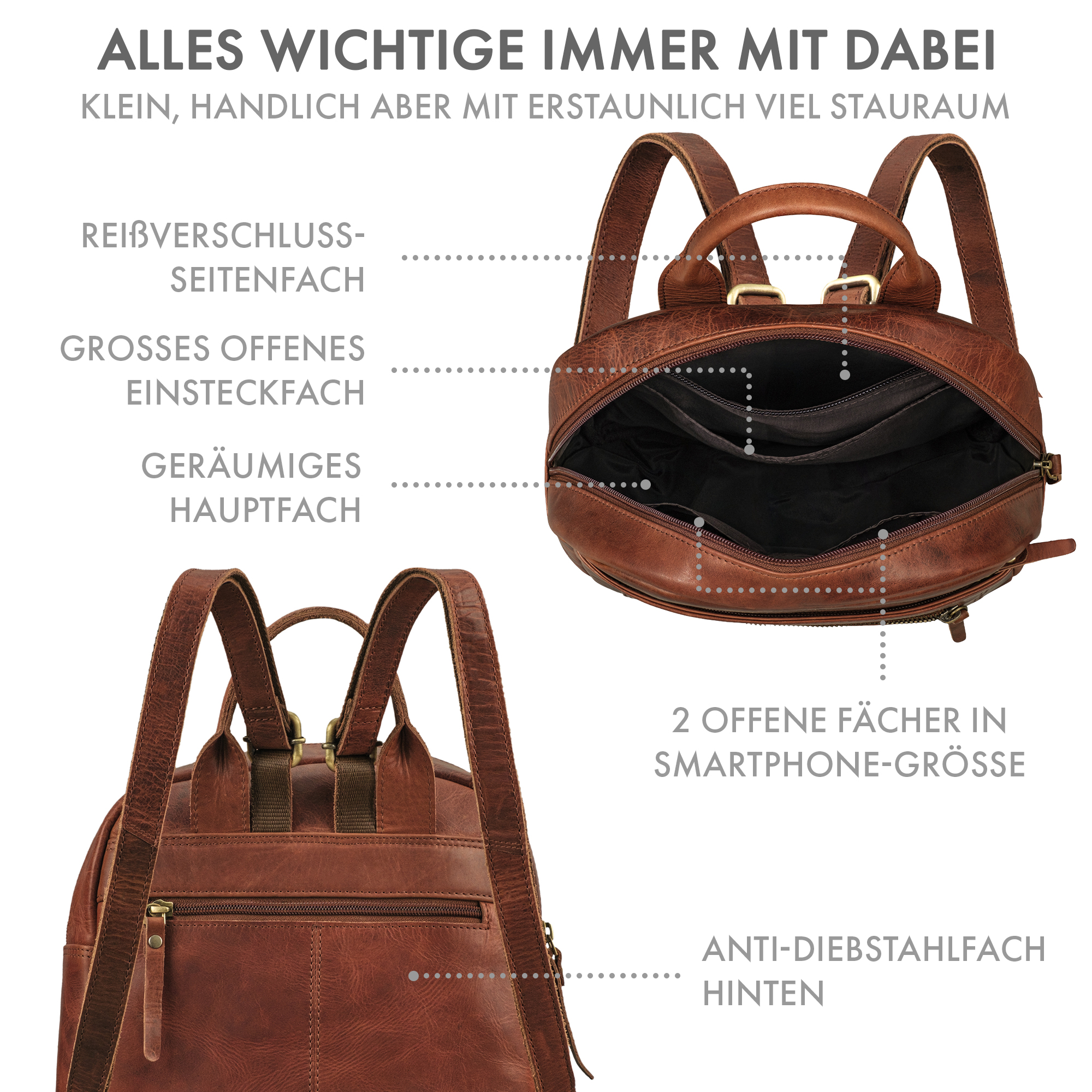 - KLEINER RUCKSACK DAMEN LEDER - Moderner Cityrucksack aus Echtleder im Vintage Stil. Ideal für Frauen, die einen kompakten Leder Rucksack mit Stil suchen.