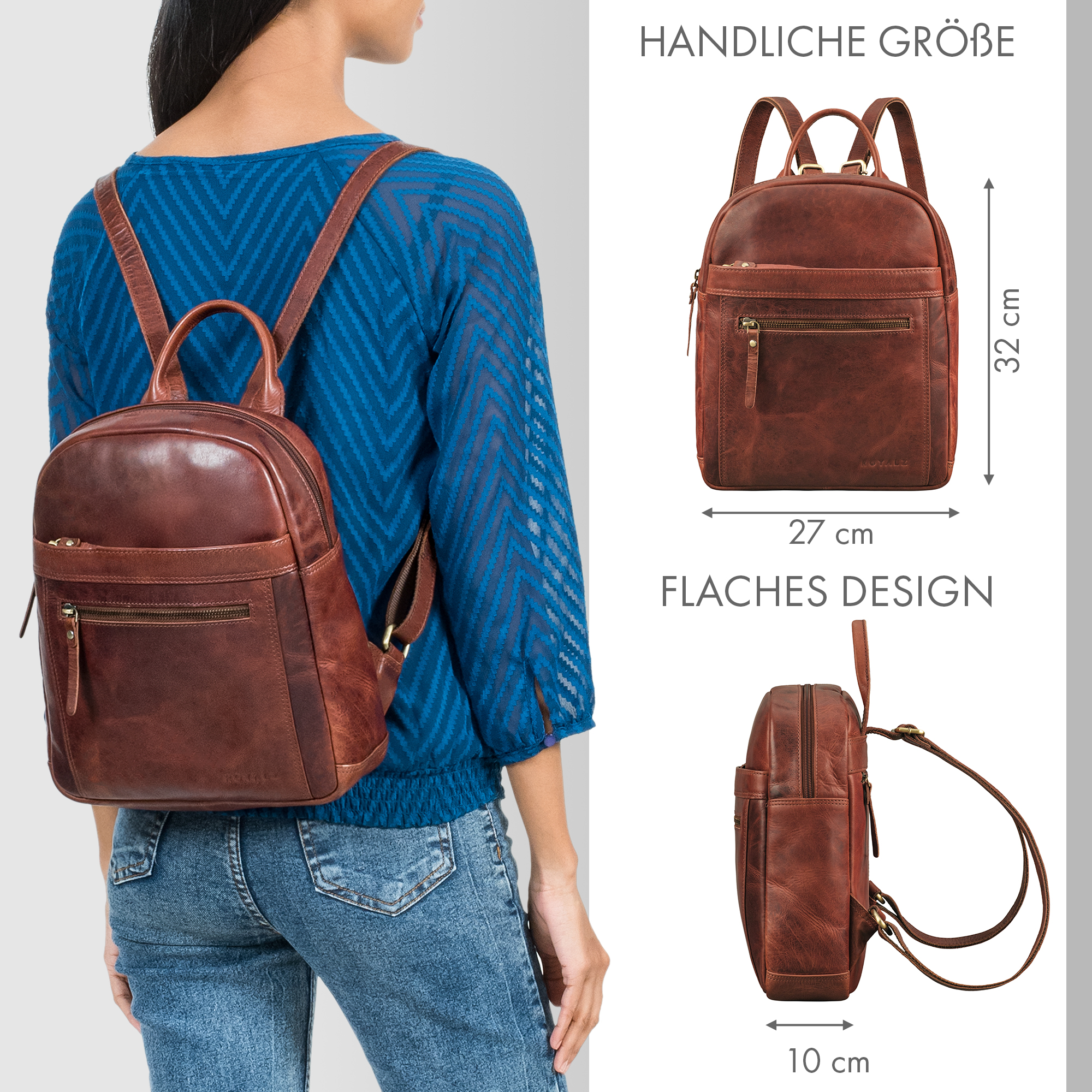 Maße ca. 27 x 10 x 32 cm, Gewicht 645 g. Ideal als kleiner Rucksack Damen Leder für Alltag und Freizeit.