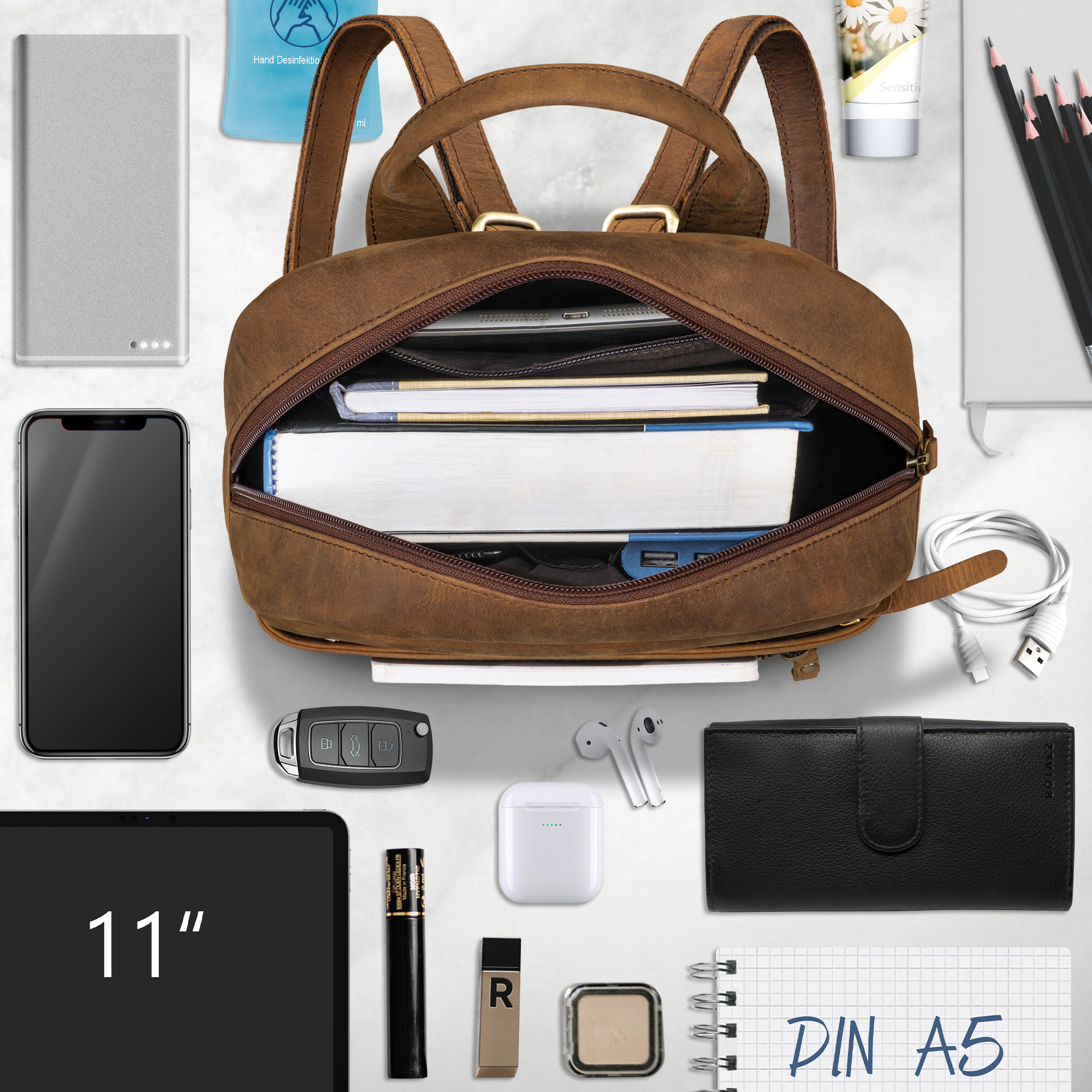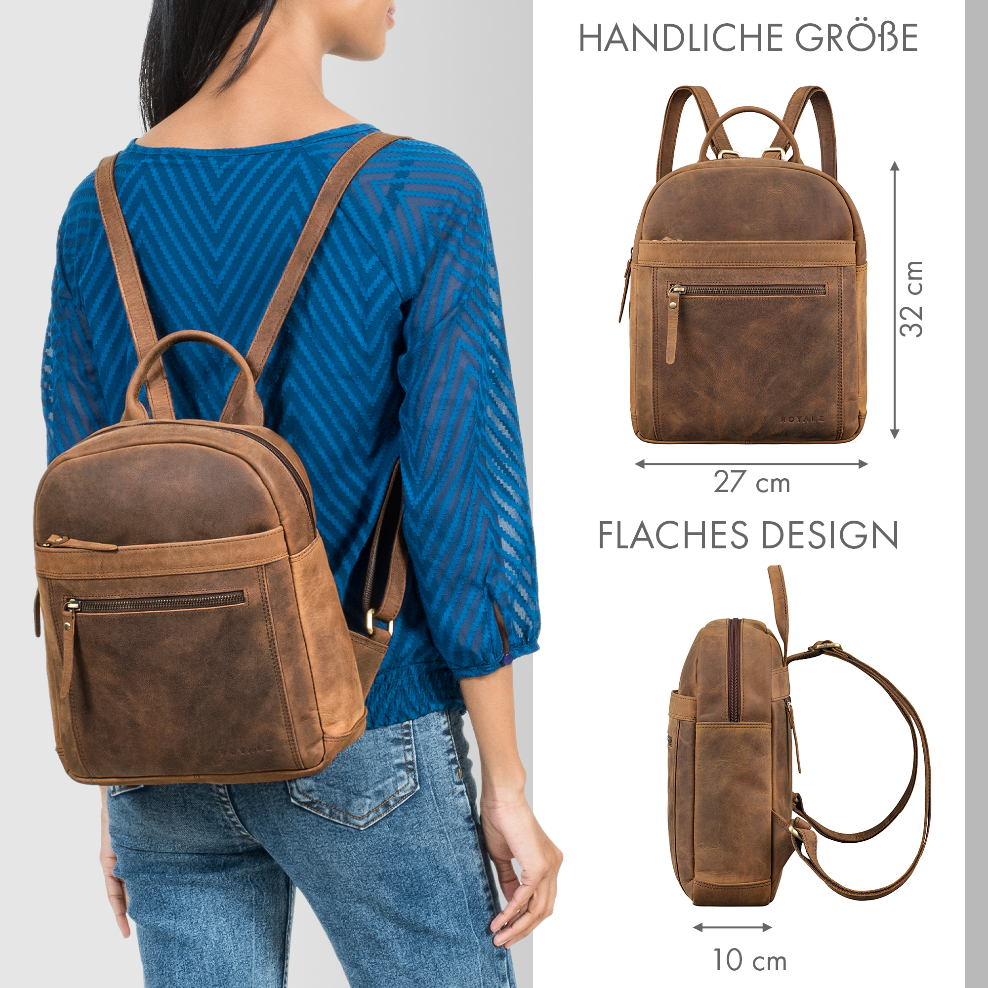 - DETAILS AUF EINEN BLICK - Maße: ca. 27 x 10 x 32 cm, Gewicht: 645 g, Material: Echtleder, Modell: "Delaware", Lieferumfang 1x ROYALZ "Delaware" Tagesrucksack Damen klein.