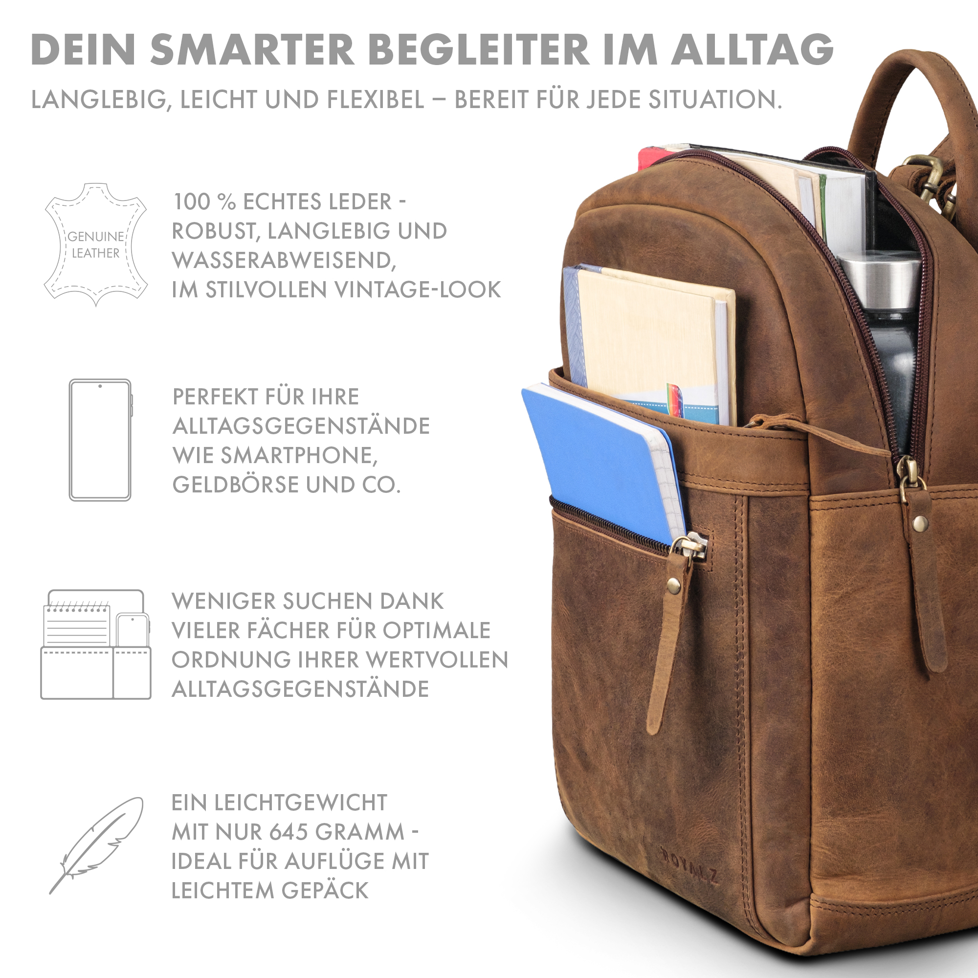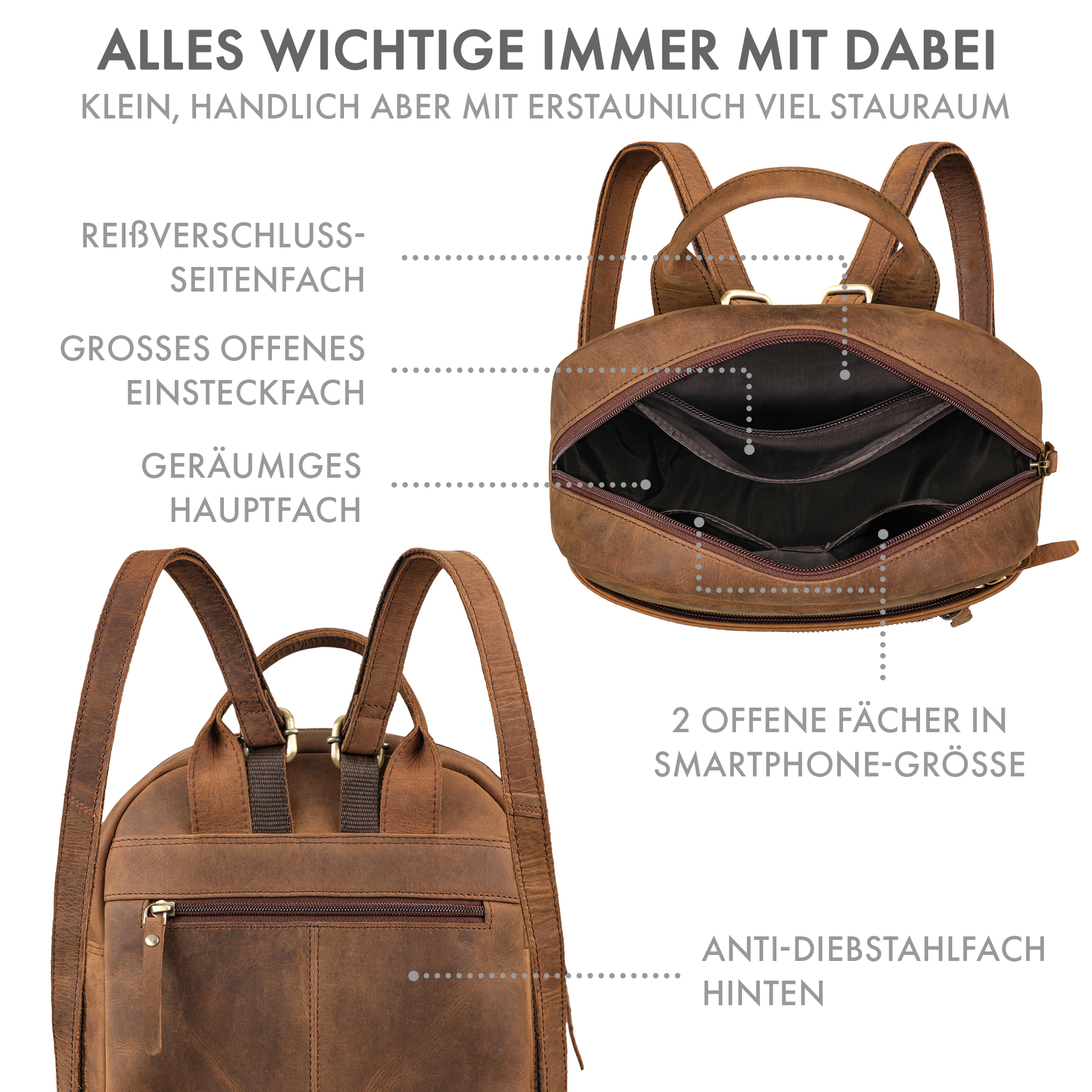 - KLEINER RUCKSACK DAMEN LEDER - Moderner Cityrucksack aus Echtleder im Vintage Stil. Ideal für Frauen, die einen kompakten Leder Rucksack mit Stil suchen.