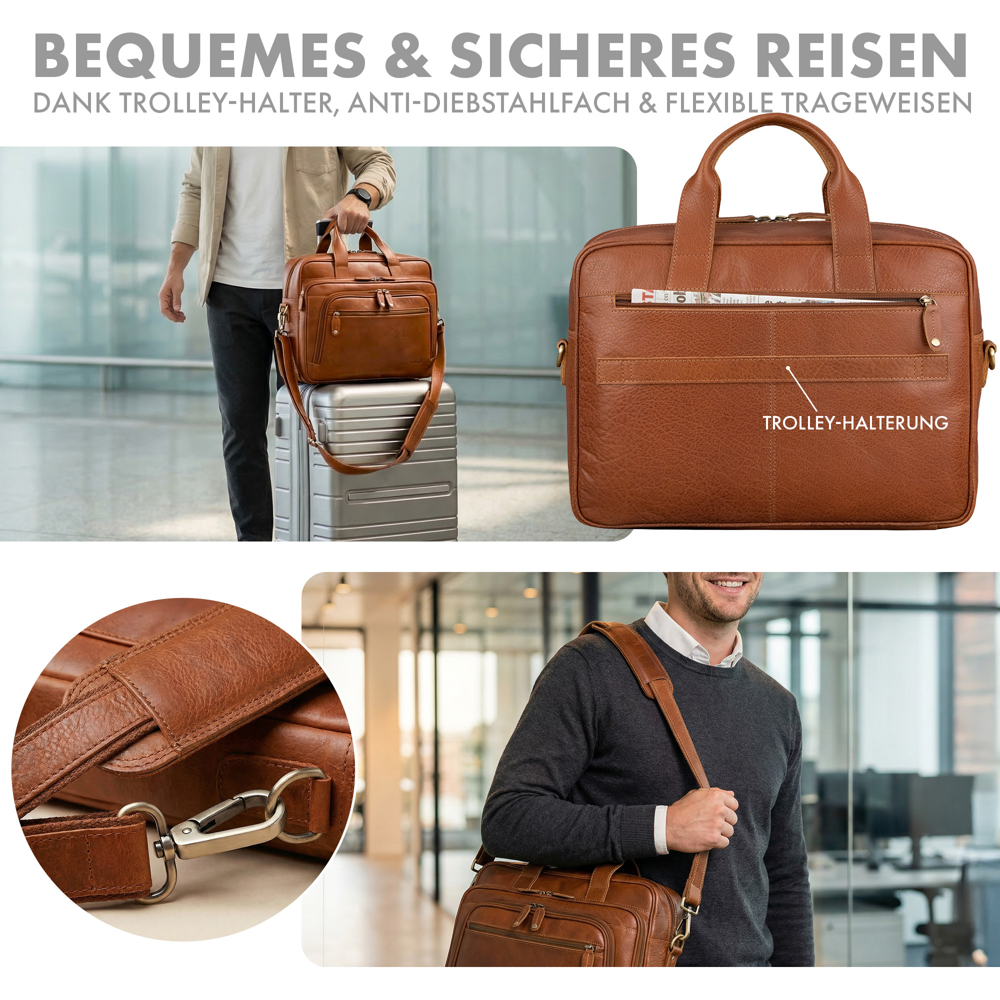 Gefertigt aus naturbelassenem Rindsleder überzeugt die Businesstasche durch eine authentische Vintage Optik mit individueller Patinaentwicklung. Funktionale Außenfächer sowie ein Anti-Diebstahlfach auf der Rückseite und praktischer Trolley-Halterung bieten zusätzlichen Komfort und Sicherheit im mobilen Berufsalltag, Geschäftsreisen und co.