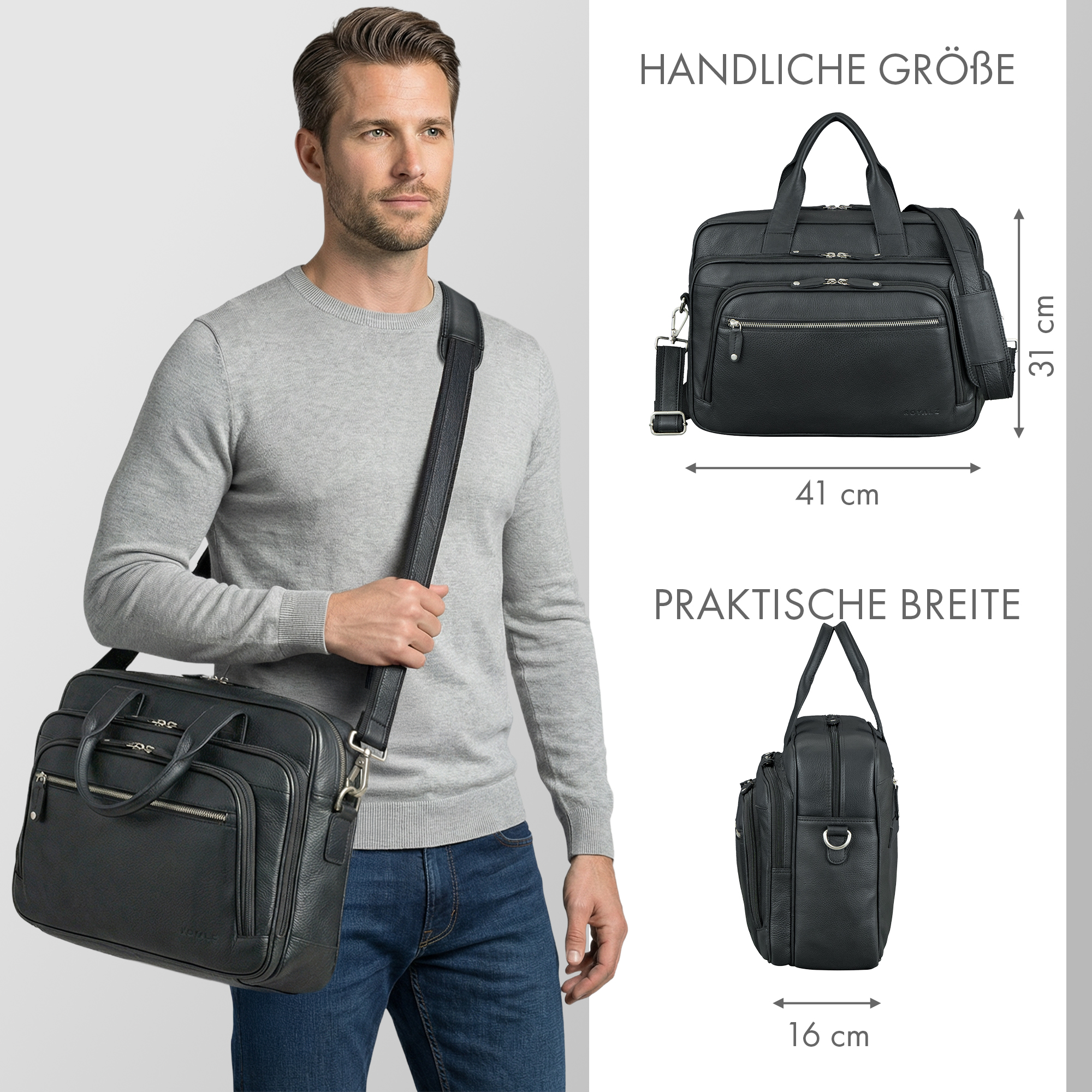 - Produktdetails: Maße (LxBxH): 41 x 16 x 31 cm | Gewicht: 1165 g | Material: Echtes Leder / Rindsleder | abnehmbarer Schultergurt mit Schulterpolster verstellbar: 95 - 145 cm | Marke: ROYALZ