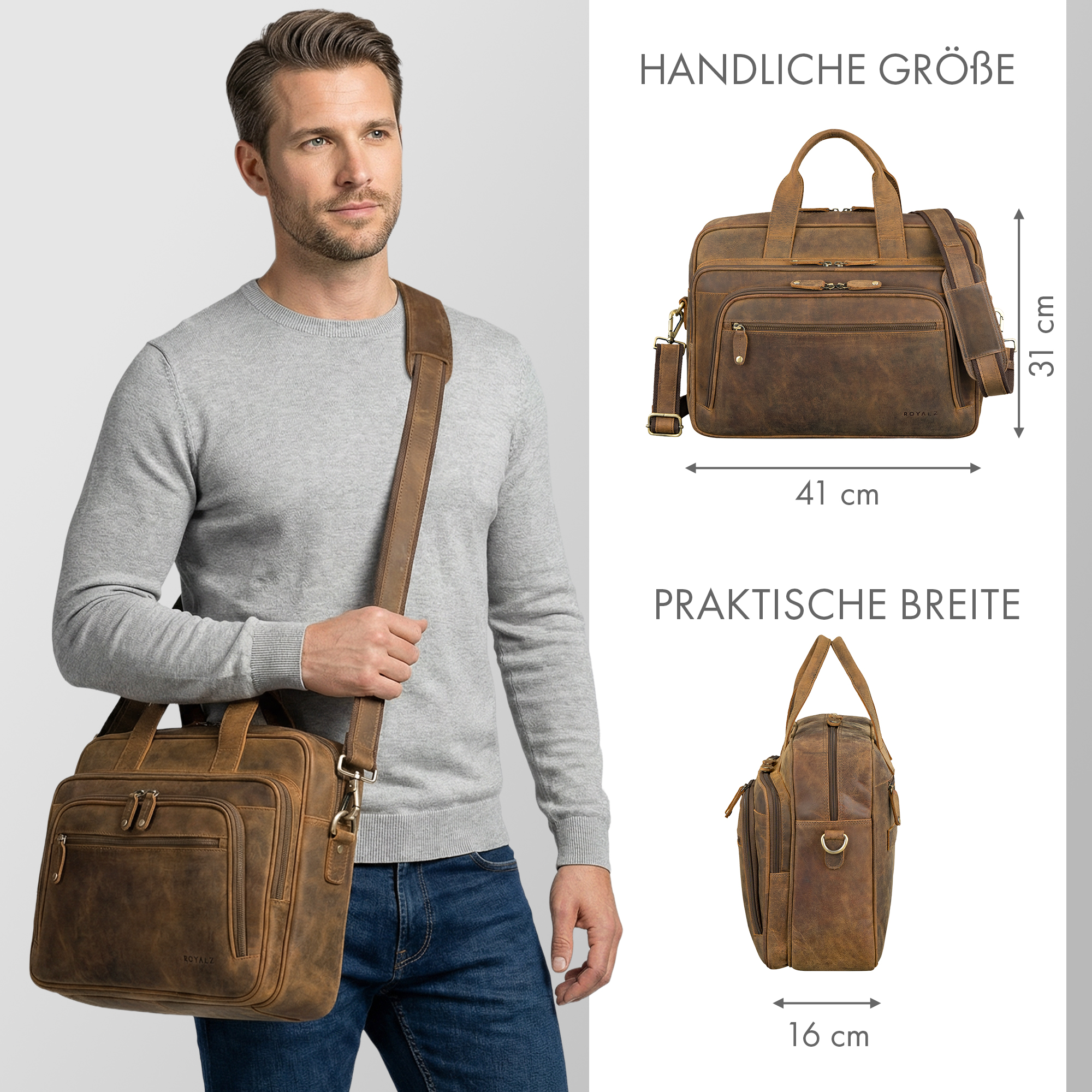 - Produktdetails: Maße (LxBxH): 41 x 16 x 31 cm | Gewicht: 1165 g | Material: Echtes Leder / Rindsleder | abnehmbarer Schultergurt mit Schulterpolster verstellbar: 95 - 145 cm | Marke: ROYALZ