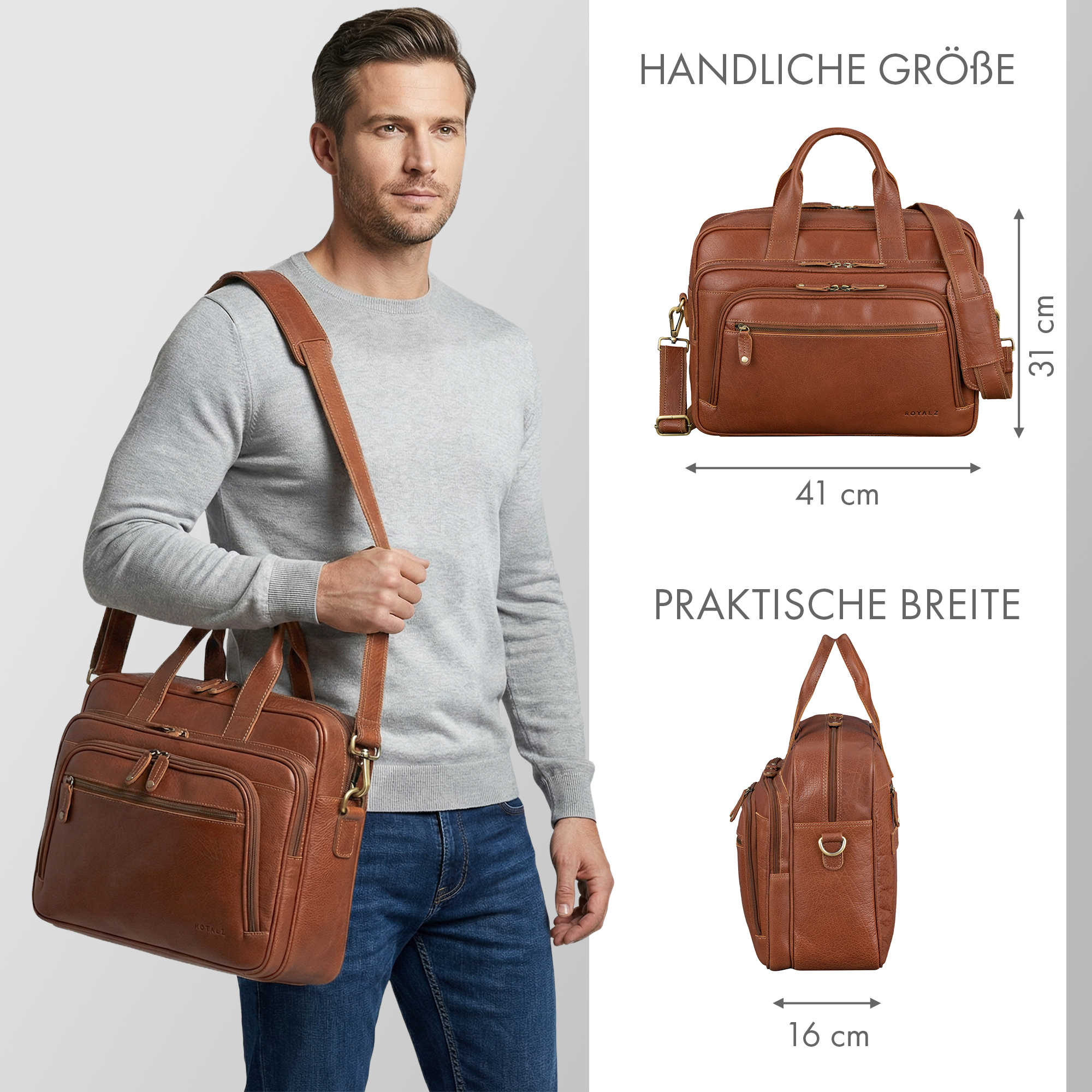 - Produktdetails: Maße (LxBxH): 41 x 16 x 31 cm | Gewicht: 1165 g | Material: Echtes Leder / Rindsleder | abnehmbarer Schultergurt mit Schulterpolster verstellbar: 95 - 145 cm | Marke: ROYALZ