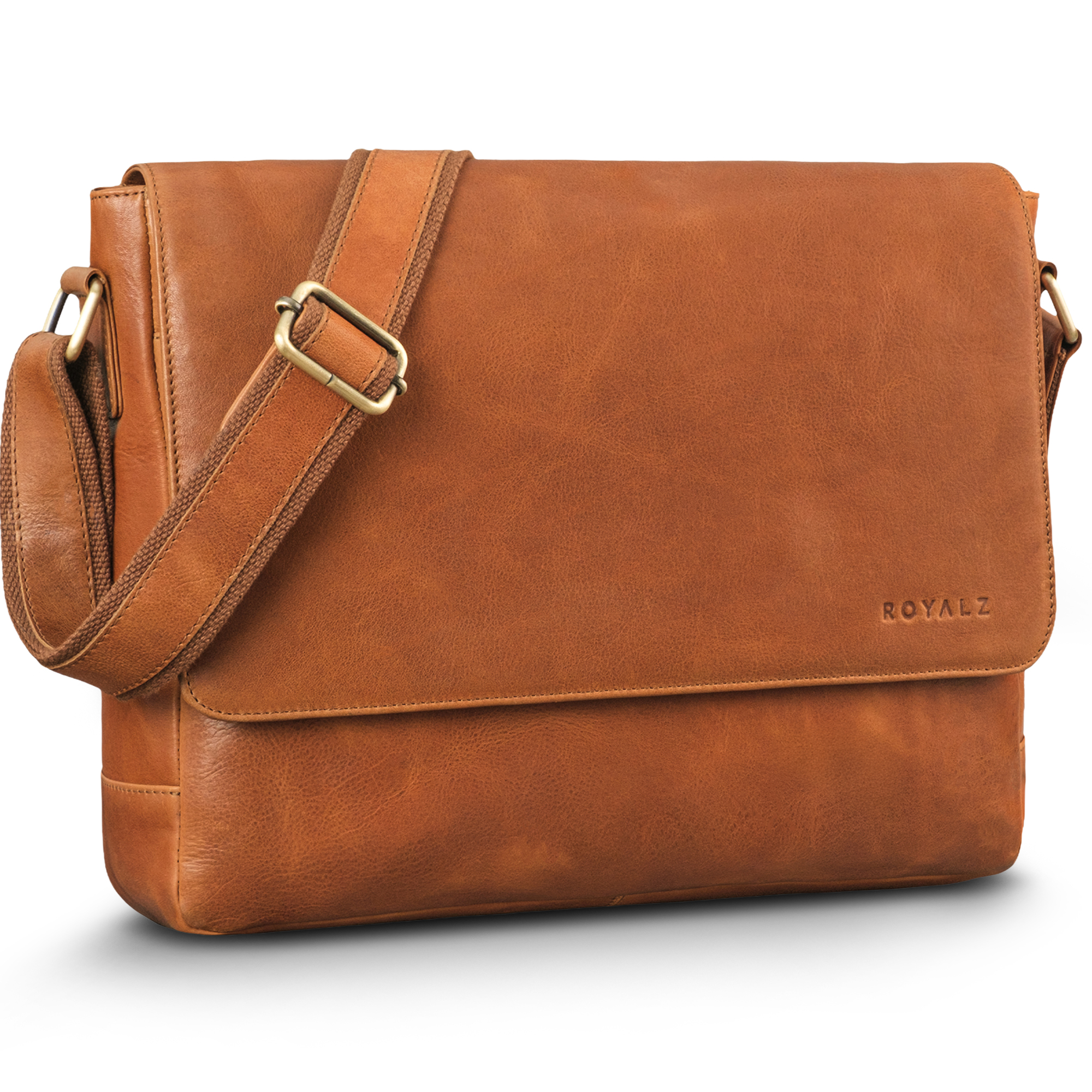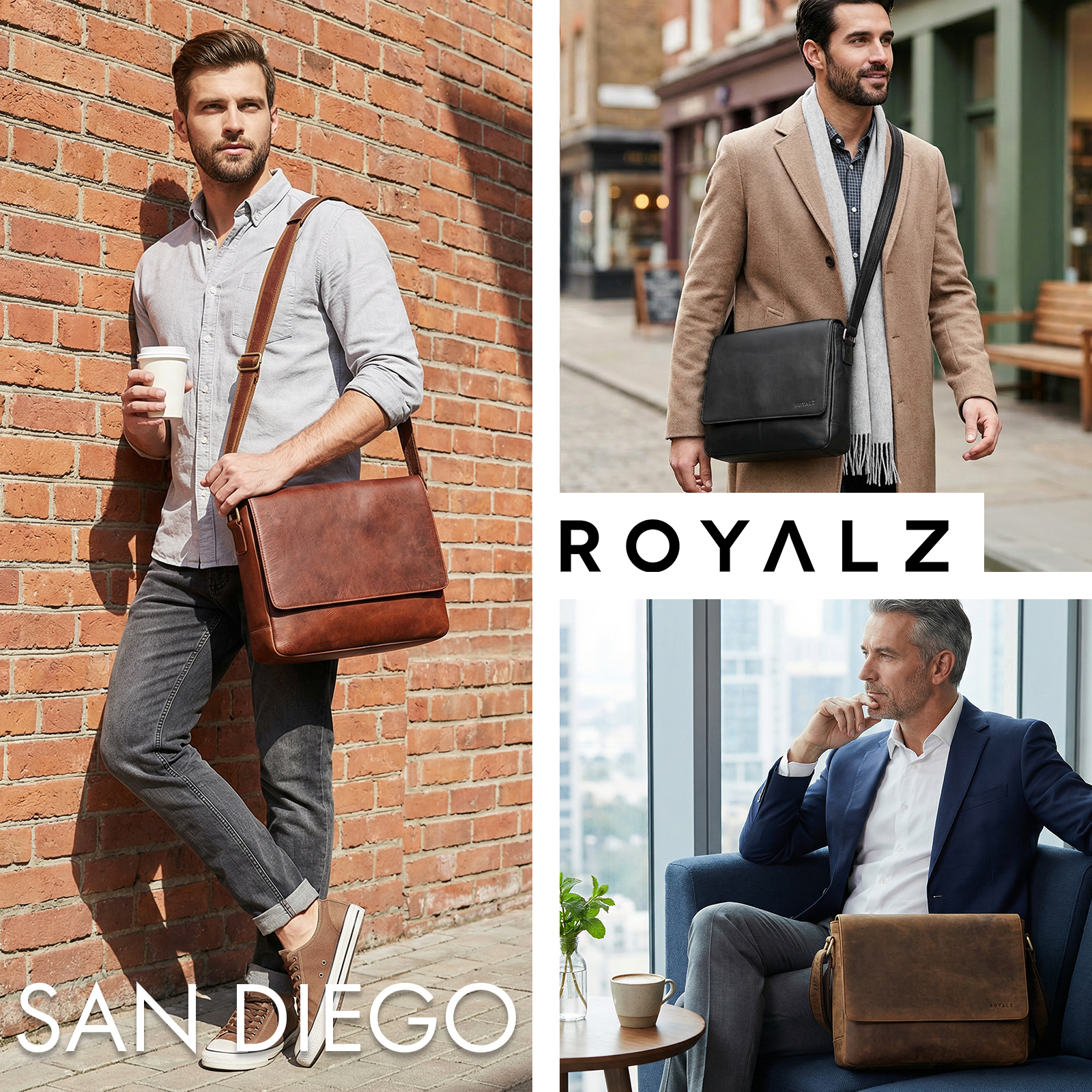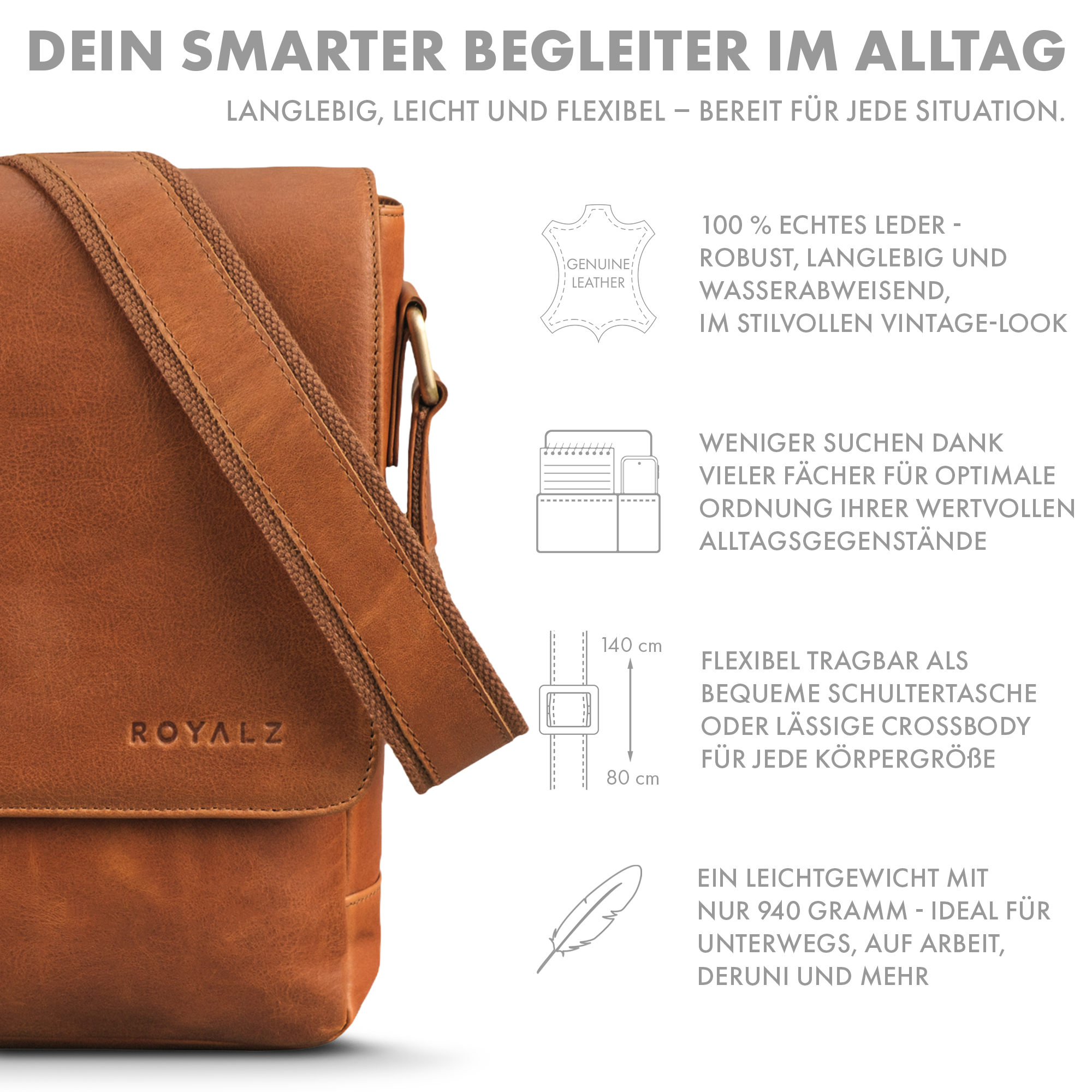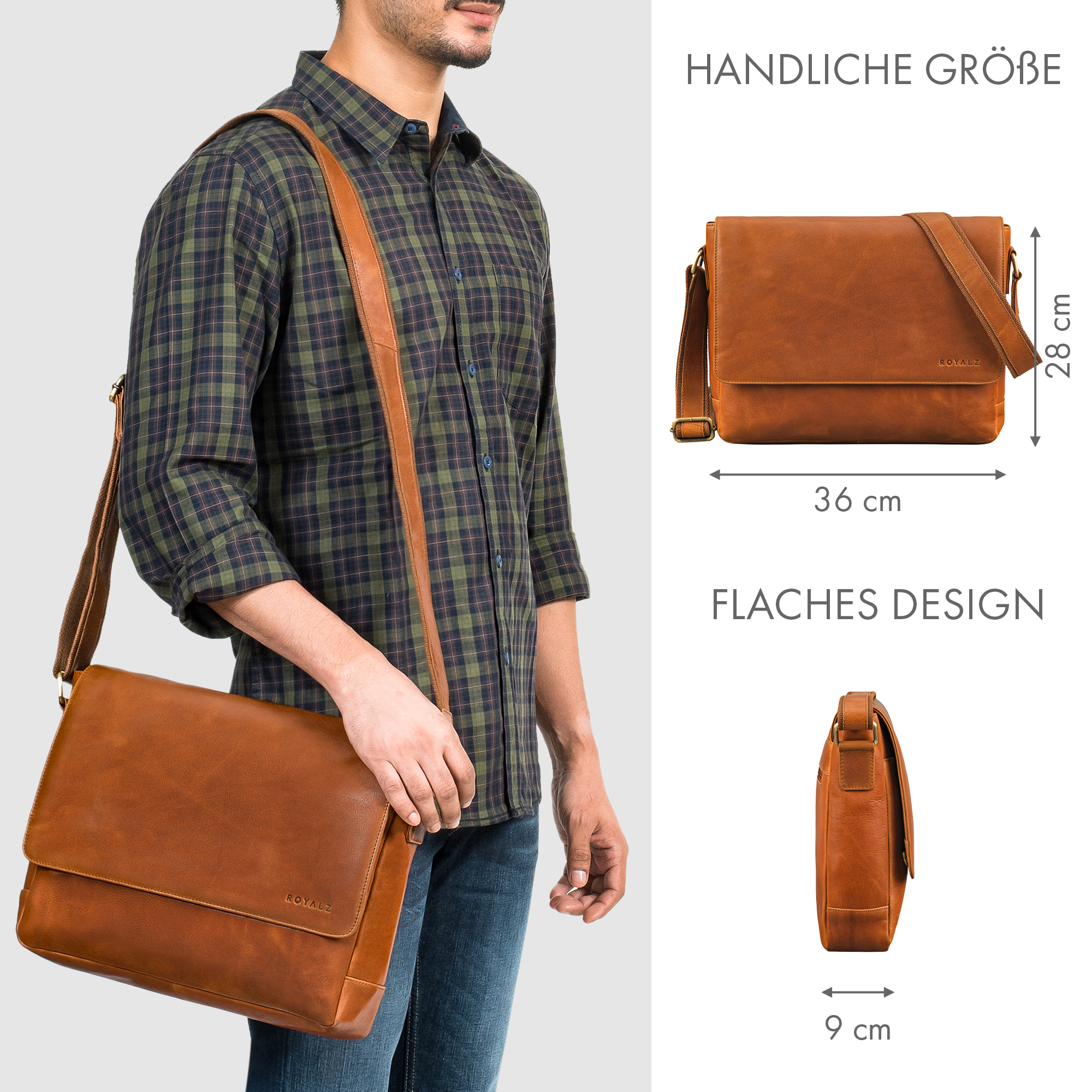- PRODUKTDETAILS - Maße ca. 36 × 9 × 28 cm | Gewicht 940 g | Modell San Diego | Material wasserabweisendes, naturbelassenes Echtleder | Verstellbarer Schultergurt 80–140 cm | Marke ROYALZ