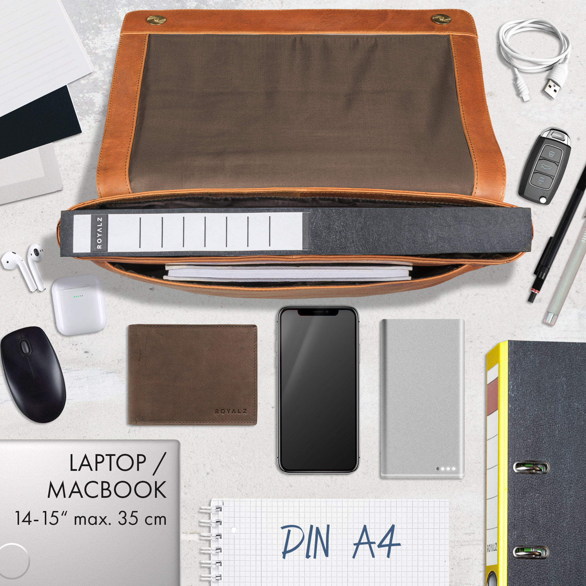 ROYALZ "San Diego" Umhängetasche Herren Leder Laptoptasche 14–15 Zoll, Business Aktentasche Bürotasche aus Echtleder, Messenger Bag flach für Beruf & Studium